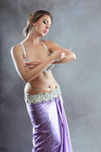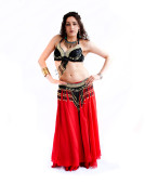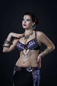Seksowne kobiety wykonują taniec brzucha w etnicznej sukni na czarnym tle, abstrakcyjne fotografii artystycznej
