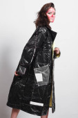 Zdjęcie pięknej smukłej kobiety ubrana w szarą sukienkę. Szare tło z plamą