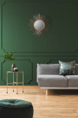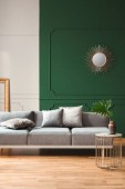 Poduszka z żółtym węzłem na szarej kanapie w szarym i zielonym salonie