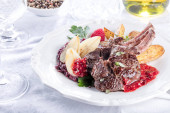 Widok z bliska pysznego mięsa z warzywami i kieliszek piwa na stole, koncepcja Oktoberfest