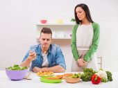 Raczej leniwy człowiek patrzy na żonę, przygotowując jedzenie