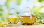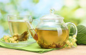 czajnik i filiżanki herbaty z lipy na drewnianym stole na tle przyrody