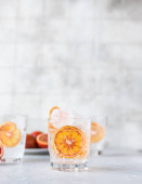 Składniki na lemoniadę truskawkową (truskawka, granat, rozmaryn i wapno) na jasnym szarym tle. Kopiuj przestrzeń. Widok z góry, kompozycja pionowa.