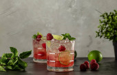 Domowa lemoniada truskawkowa w szklance ze świeżych truskawek, rozmarynem, granatu i wapna na jasnym szarym kamiennym stole. Orzeźwiający napój letni. Koncepcja tła baru koktajlowego. Kopiuj przestrzeń.