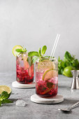 Zdjęcie "Domowa lemoniada truskawkowa w szklance ze świeżych truskawek, rozmarynem, granatu i wapna na jasnym szarym kamiennym stole. Orzeźwiający napój letni. Koncepcja tła baru koktajlowego. Kopiuj przestrzeń." może być wykorzystywane do celów osobistych i komercyjnych zgodnie z warunkami zakupionej licencji Royalty-free. Obraz jest dostępny do pobrania w jakości wysokiej rozdzielczości do 5760x3840.