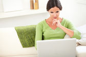 młoda kobieta siedzi na kanapie i korzysta z laptopa
