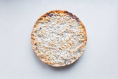 Całe ciasto wiśniowe z płatkami migdałów i cukrem w proszku.