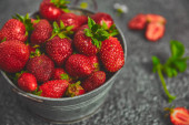Truskawki w szarej misce. Świeże truskawki. Piękne truskawki.