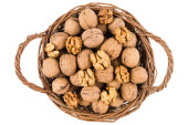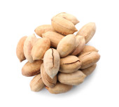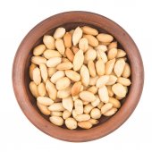 Orzechy pecan w naczyniu ceramicznym na białym tle.