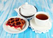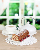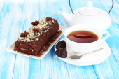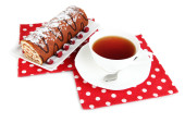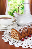 słodka bułka z filiżanką herbaty na stół szczegół