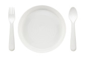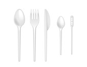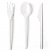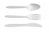 Komplet białego plastikowego łyżki, widelca i noża na białym