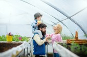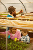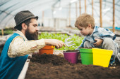 Dwóch ogrodników spojrzeć na piękny kwiat w doniczce żółty. Brutalny mężczyzna w kapelusz fedora z długą brodą tulenie uśmiechający się blond dama w szklarni. Koncepcja biznesowa dla rodzin z dziećmi