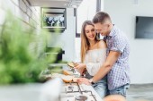 Młoda piękna para gotowanie w kuchni, selektywne skupienie