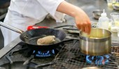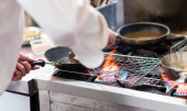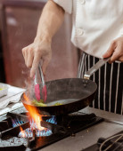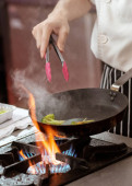 Szef kuchni gotowanie jedzenie w kuchni, kucharz przygotowuje jedzenie