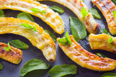 Zdjęcie "Połówki bananów z grilla z cukrem pudrem na czarnym pokładzie kuchni i kamienia łupkowego. Pieczone deser banana z mięty na czarnym tle tabeli. Widok z bliska" może być wykorzystywane do celów osobistych i komercyjnych zgodnie z warunkami zakupionej licencji Royalty-free. Obraz jest dostępny do pobrania w jakości wysokiej rozdzielczości do 5760x3840.