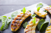 Połówki bananów z grilla z cukrem pudrem na czarnym pokładzie kuchni i kamienia łupkowego. Pieczone deser banana z mięty na czarnym tle tabeli. Widok z bliska
