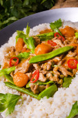 Frykaset indyczy na ryżu ze szparagami i papryką