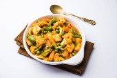 Zdjęcie "Mix warzyw curry-indyjski przepis danie główne zawiera marchew, kalafior, zielony groszek i fasola, kukurydza, Capsicum i Paneer/twarożek z tradycyjnym Masala i curry, selektywne skupienie" może być wykorzystywane do celów osobistych i komercyjnych zgodnie z warunkami zakupionej licencji Royalty-free. Obraz jest dostępny do pobrania w jakości wysokiej rozdzielczości do 5760x3840.