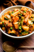 Zdjęcie "Mix warzyw curry-indyjski przepis danie główne zawiera marchew, kalafior, zielony groszek i fasola, kukurydza, Capsicum i Paneer/twarożek z tradycyjnym Masala i curry, selektywne skupienie" może być wykorzystywane do celów osobistych i komercyjnych zgodnie z warunkami zakupionej licencji Royalty-free. Obraz jest dostępny do pobrania w jakości wysokiej rozdzielczości do 5760x3840.