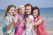 rudy, brunetka i blondynka dziewczyny siedzi w zielonej trawie w