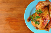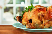 cały Kurczak pieczony na zielony talerz na drewniane tła