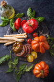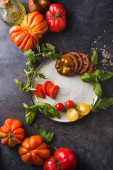 Dojrzałe pomidory do gotowania naczyń warzywnych na szarym tle
