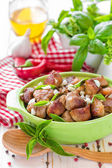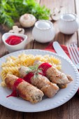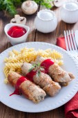 Champignons nadziewane kurczaka podudzia na białej płycie z makaronem, selektywne skupienie