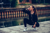 Piękna sportowa dziewczyna biorący przerwę po jogging nad rzeką
