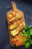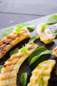 Połówki bananów z grilla na czarnym pokładzie kuchni i kamienia łupkowego. Pieczone deser banana z mięty na czarnym tle. Asian zdrowej żywności. Widok z bliska