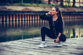 Młoda kobieta w czarnym stroju sportowego odpoczynku podczas słuchania mu