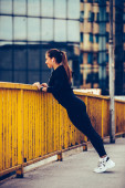 Zdjęcie "Młoda kobieta ćwiczy rozciąganie na moście." może być wykorzystywane do celów osobistych i komercyjnych zgodnie z warunkami zakupionej licencji Royalty-free. Obraz jest dostępny do pobrania w jakości wysokiej rozdzielczości do 5760x3840.