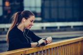 Młoda kobieta relaksująca po jogging na moście, nocą