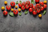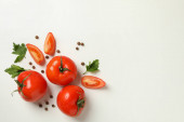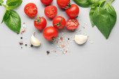 Kompozycja z dojrzałych pomidorów wiśniowych i liści bazylii na białym tle, widok z góry
