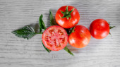 Płaska kompozycja z dojrzałych pomidorów wiśniowych i liści bazylii na kolorowym tle. Miejsce na tekst