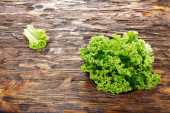 Kilka pietruszki i kilka sałaty na brązowym drewnianym stole.