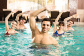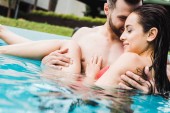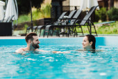 przystojny Brodaty mężczyzna patrząc na atrakcyjną kobietę w basenie