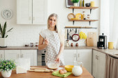 piękna kobieta gotowanie z patelni i łopatki w kuchni w godzinach porannych