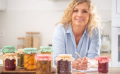 Portret szczęśliwej dorosłego kobiety w nowoczesnej kuchni z garnka i