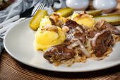 Smażona wątróbka drobiowa z cebulą podawane z ziemniakami puree i p