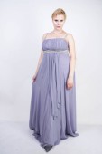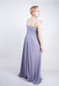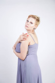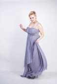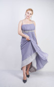 Elegancka Gruba Kobieta w szarej długiej sukni. ładne plus rozmiar kobiety w strój wieczorowy stojący na białym tle Studio. krótkie włosy Pulchne dziewczyny w szarej odzieży pozowanie sam.