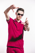 Elegancki młody przystojny mężczyzna w eleganckiej sukni casual i okulary w studiu na czerwonym tle.