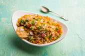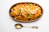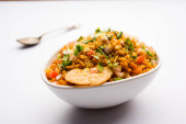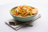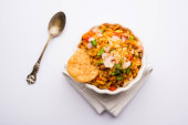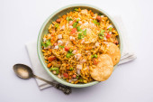 Bhelpuri Chaat/chat to strona drogowa smaczne jedzenie z Indii, serwowane w misce lub talerzu. Selektywna koncentracja