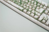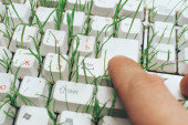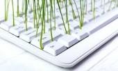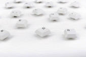 Biała klawiatura z kiełków rośnie z niego na białym tle drewnianym