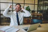 Zdjęcie "Zachwycony Hipster facet w słuchawkach Cheers do oglądania drużyny mecz na laptopie podczas wolnego czasu w kawiarni wnętrze, zdumiony emocjonalny mężczyzna Freelancer obchodzi osiągnięcie i ukończenie projektora" może być wykorzystywane do celów osobistych i komercyjnych zgodnie z warunkami zakupionej licencji Royalty-free. Obraz jest dostępny do pobrania w jakości wysokiej rozdzielczości do 5760x3840.