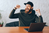 Zachwycony Hipster facet w słuchawkach Cheers do oglądania drużyny mecz na laptopie podczas wolnego czasu w kawiarni wnętrze, zdumiony emocjonalny mężczyzna Freelancer obchodzi osiągnięcie i ukończenie projektora