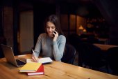 Profesjonalny copywriter korzystających pracy na odległość, siedząc w kawiarni i rozmawiając z szefem przy użyciu nowej aplikacji na telefon komórkowy do rozmowy, zamyślony kobieta instrumentach klawiszowych wiadomości przez netbook
