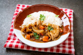 Japoński curry ryż z plasterki wieprzowiny, marchwi i cebuli