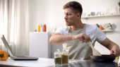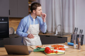 Człowiek degustacja gotowanej zupy z patelni, noszenie na płycie w kuchni, przygotowywanie kolacji