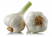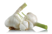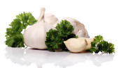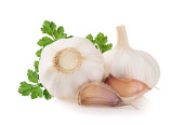 Świeże cebulki czosnku z pietruszki liście izolowane