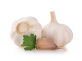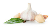 Cebulki czosnku z ząbek czosnku i liść bazylii na białym tle